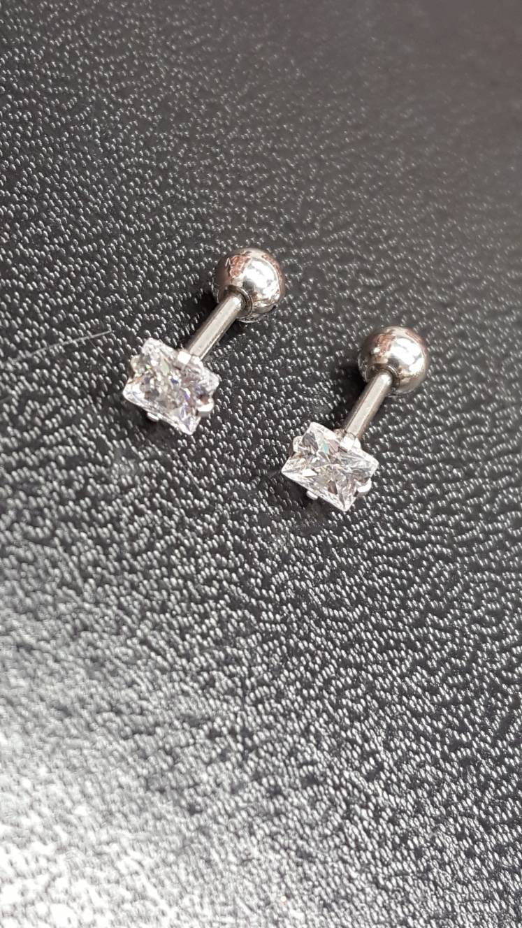 Solid Titanium Screw on Studs with High Quality +AAA Cubic Zirconia Square Crystal ✔Hypoallergenic Studs ✔Waterproof ✔Medical Grade For New Piercings ✔ 18 Gauge There are 2 sizes to choose from: • 3mm • 4mm •Titanium• ✔ Screw On Backing (Titanium) ✔ Hypoallergenic ✔ Can be worn while swimming/bathing ✔ Nickel-Free ✔ Sensitive ears SHIPPING: Processing times are 1-2 business days. See our shipping policies or our shop announcement for estimated arrival times. PACKAGING: All orders will come shipped inside a Beautiful Felt Pouch