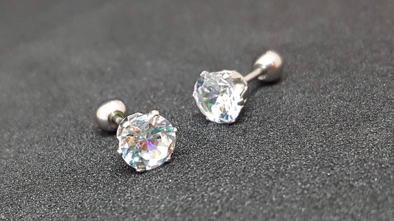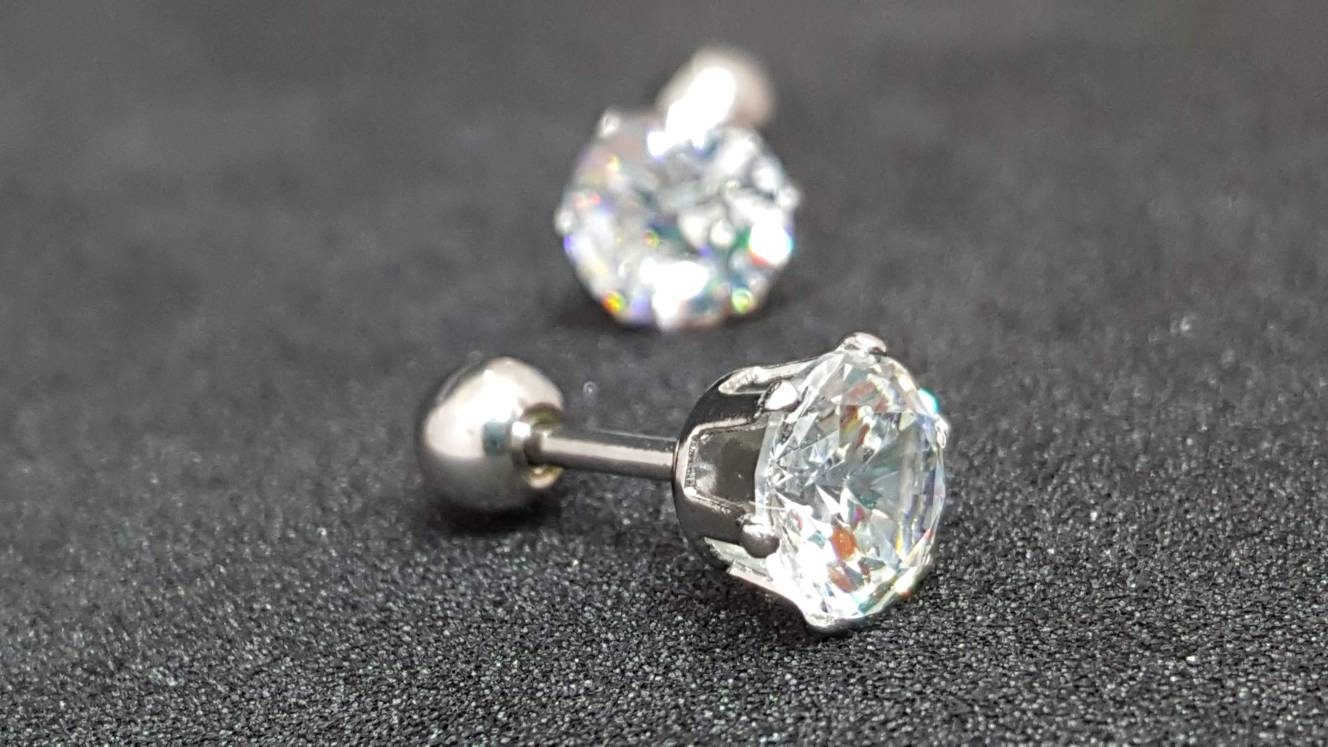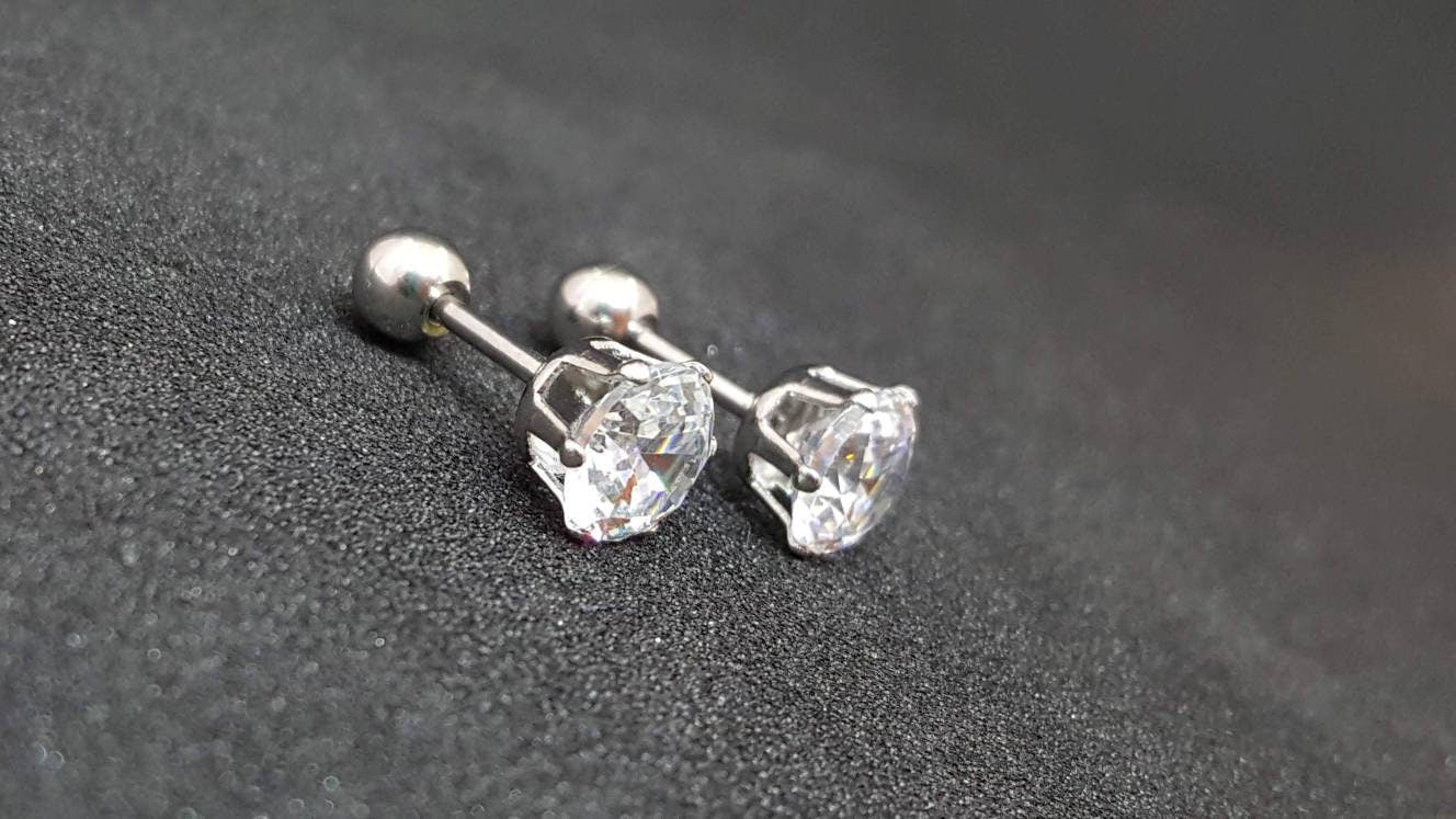 Solid Titanium Screw on Studs with High Quality +AAA Cubic Zirconia ✔Hypoallergenic Studs ✔Waterproof ✔Medical Grade For New Piercings ✔ 18 Gauge There are 4 sizes to choose from: • 3mm • 4mm • 5mm • 6mm •Titanium• ✔ Screw On Backing (Titanium) ✔ Hypoallergenic ✔ Can be worn while swimming/bathing ✔ Nickel-Free ✔ Sensitive ears SHIPPING: Processing times are 1-2 business days. See our shipping policies or our shop announcement for estimated arrival times. PACKAGING: All orders will come shipped inside a Beautiful Felt Pouch
