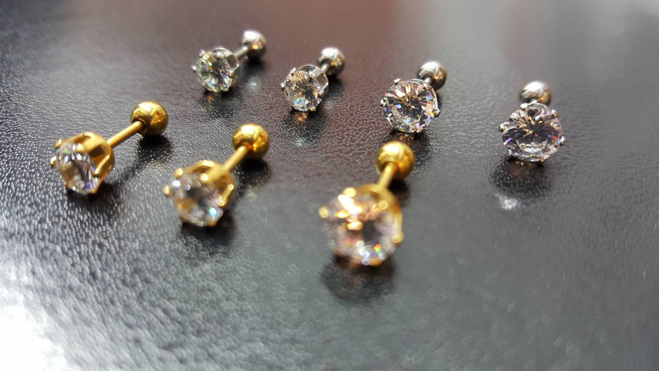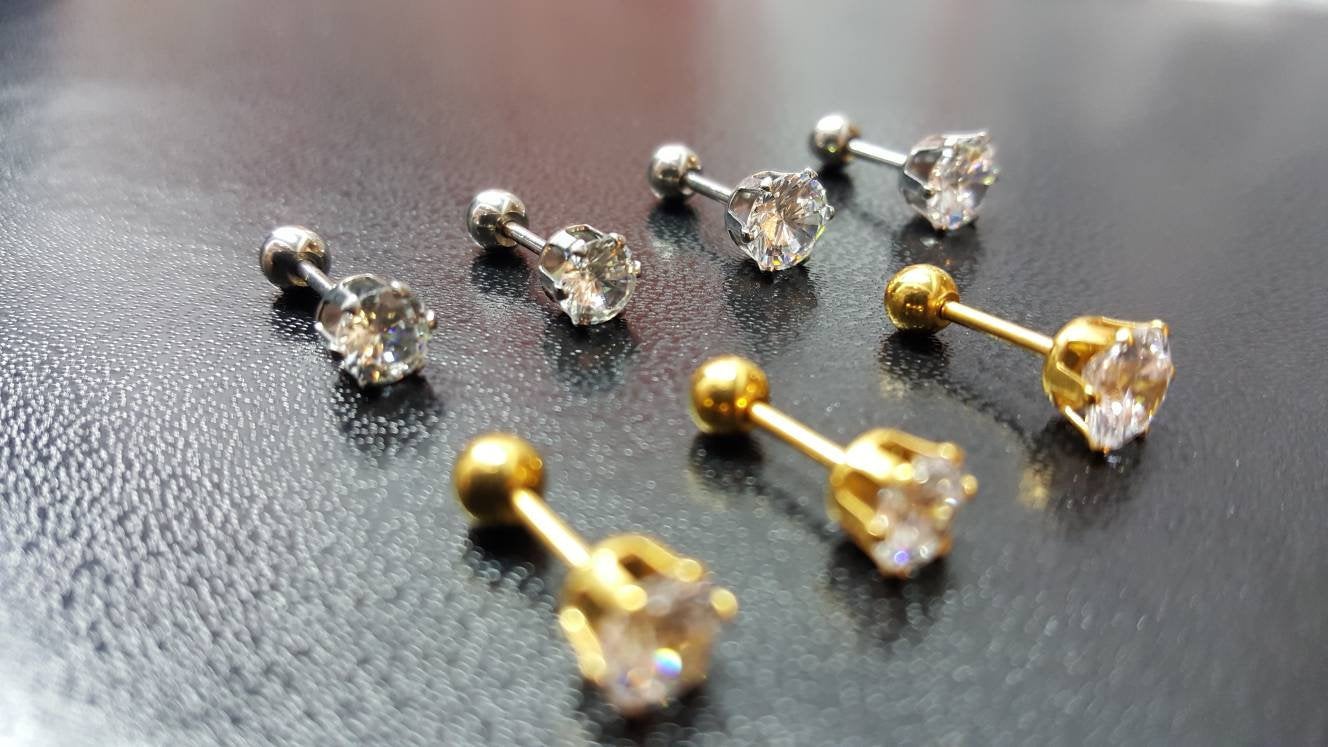 Solid Titanium Screw on Studs with High Quality +AAA Cubic Zirconia ✔Hypoallergenic Studs ✔Waterproof ✔Medical Grade For New Piercings ✔ 18 Gauge There are 4 sizes to choose from: • 3mm • 4mm • 5mm • 6mm •Titanium• ✔ Screw On Backing (Titanium) ✔ Hypoallergenic ✔ Can be worn while swimming/bathing ✔ Nickel-Free ✔ Sensitive ears SHIPPING: Processing times are 1-2 business days. See our shipping policies or our shop announcement for estimated arrival times. PACKAGING: All orders will come shipped inside a Beautiful Felt Pouch
