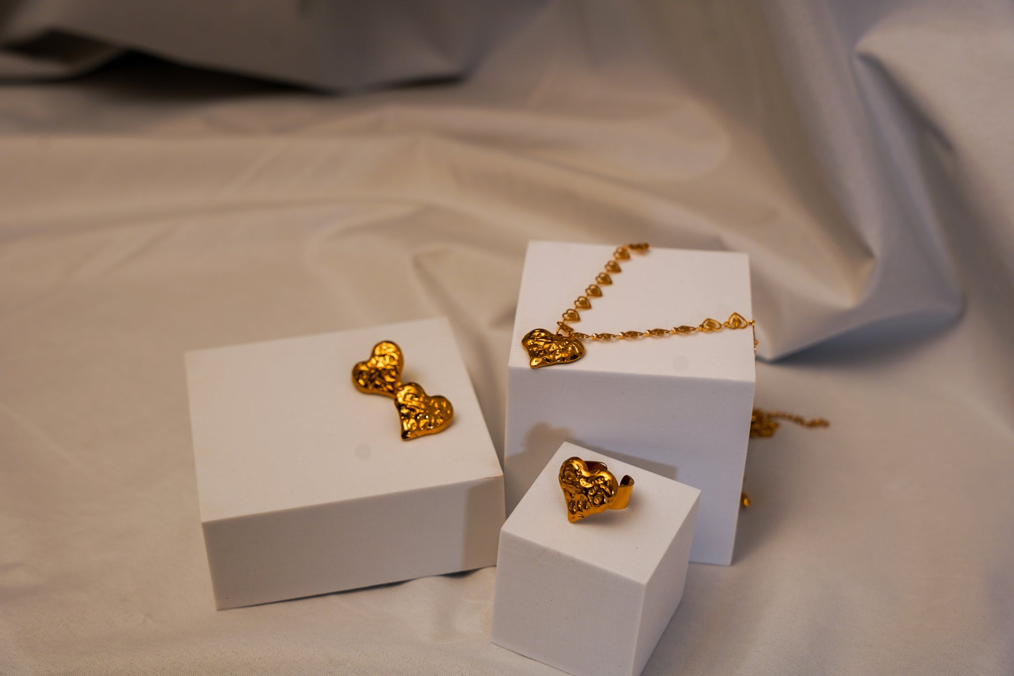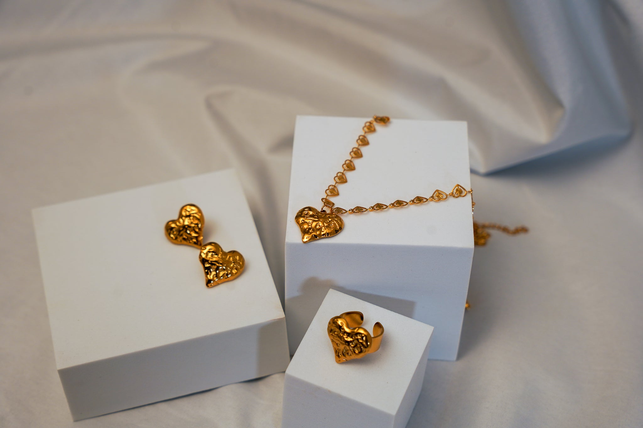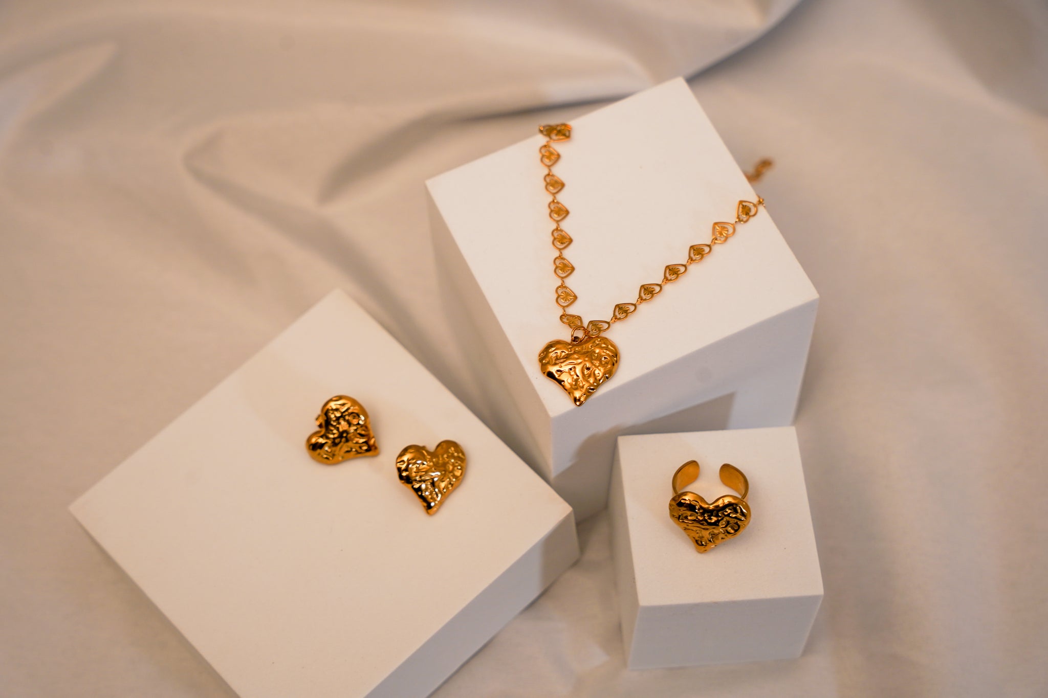 3pc Heart 18K Gold Titanium Chain, Earring, and Adjustable Ring Set