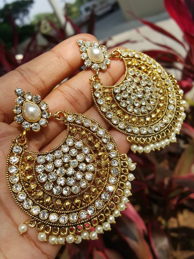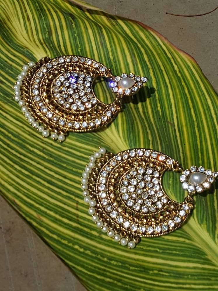 Gold Indian Mastani Large Round Crystal Earrings Pair