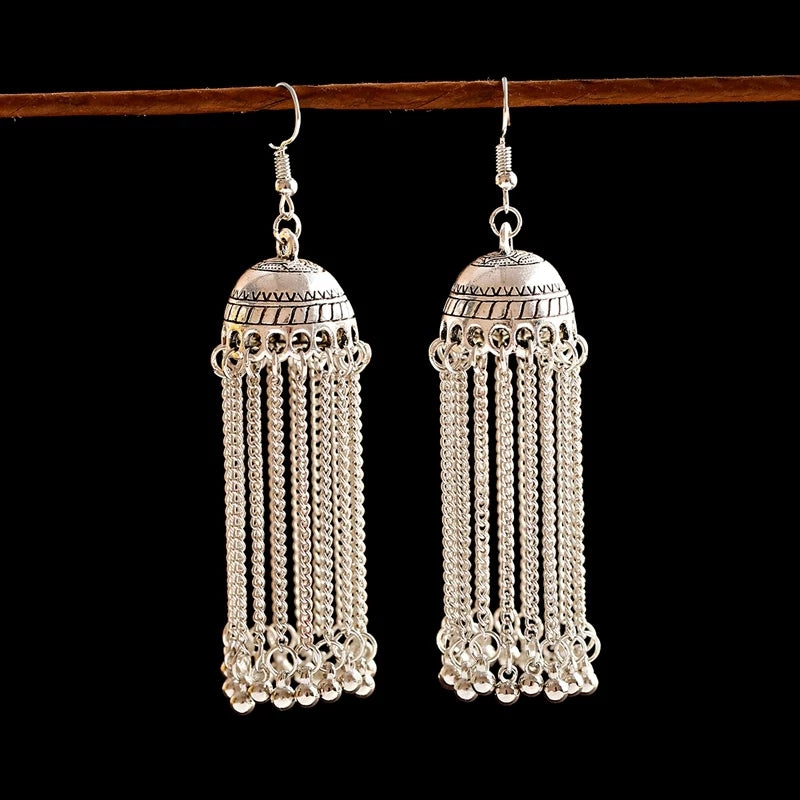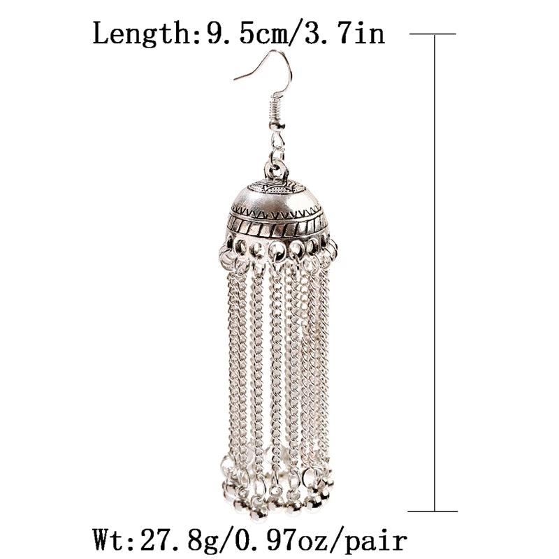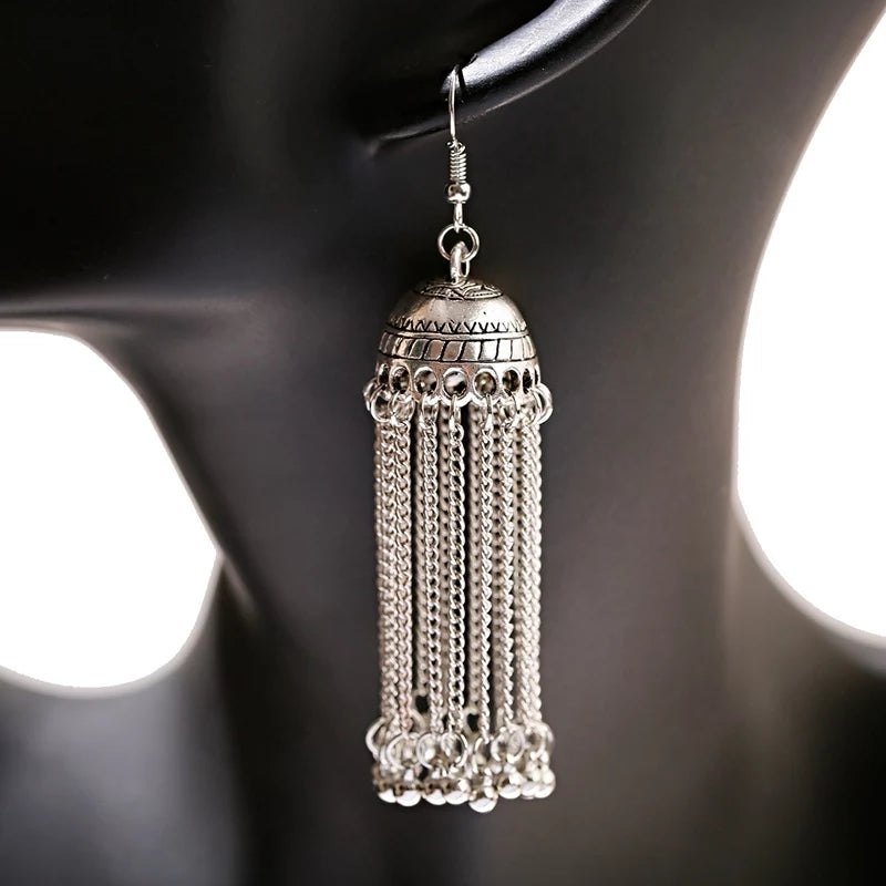 Silver Indian Long Hanging Jhumka Round Earrings Pair